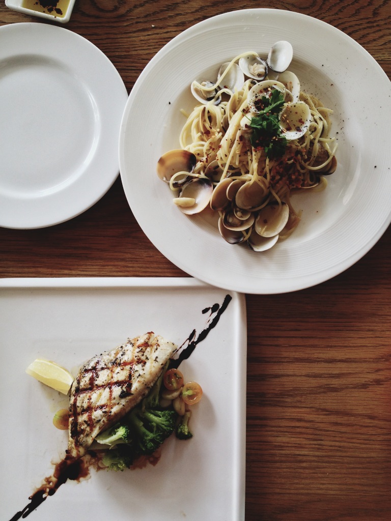 The mother attacked the latter and I, the beautiful fish. Because well, fish. Also because I wanted to pick at the bread and my mother’s delicately twirled mound of shiny pasta strands (the joys of mother-daughter bonding sessions). For almost $30, I got a minute portion which only satisfied me with the addition of that luscious but slightly too oily balsamic. Thick oil drops lazed about in excess on every inch of the dish, but yes, the fish resembled a shiny piece of ivory silk which broke away in delectable flakes of oiled flesh.