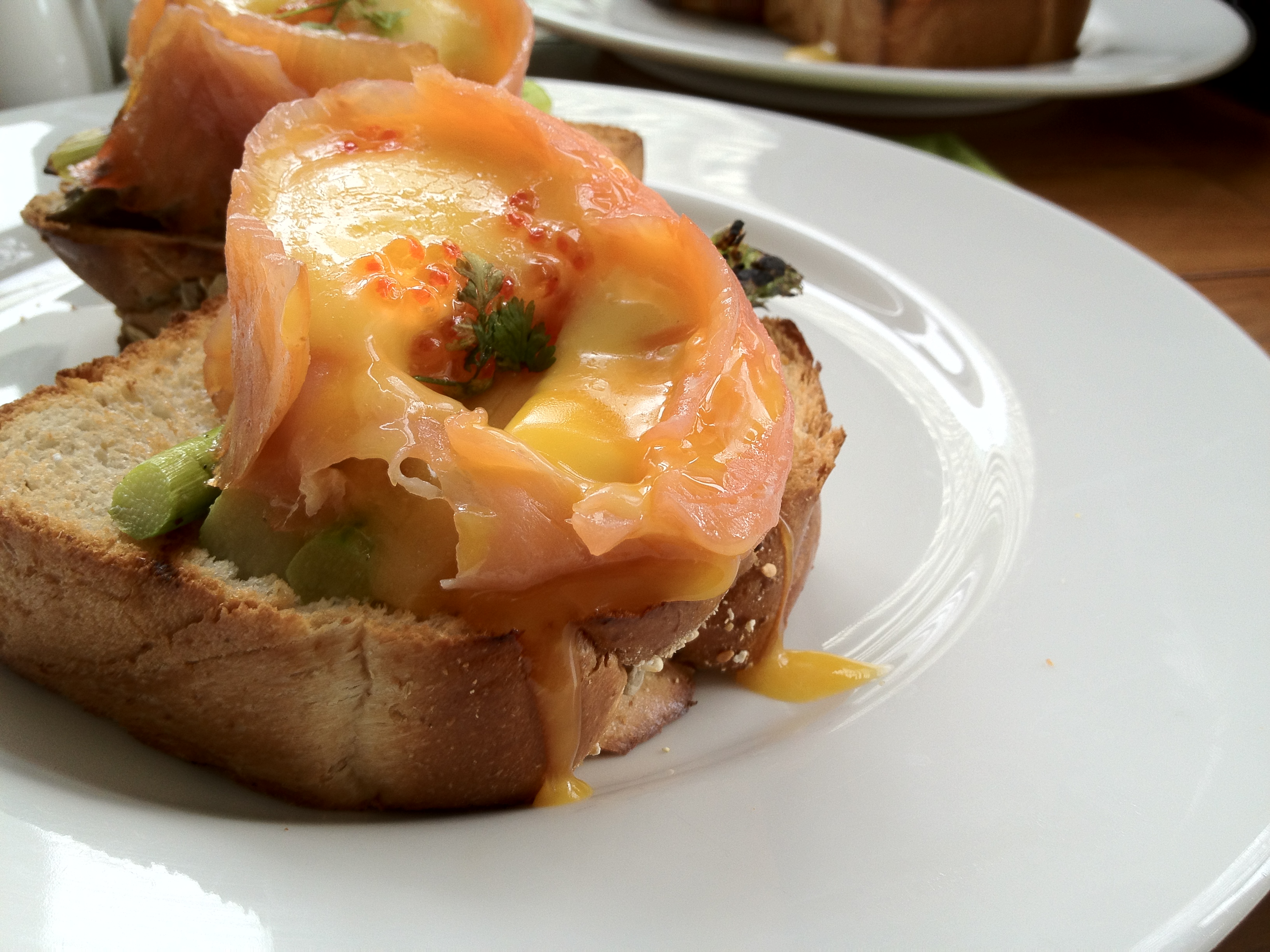 Avocado, grilled asparagus spears, two perfectly poached eggs wrapped with Norwegian smoked salmon, gorgeous homemade hollandaise and salmon pearls resting like jewels on top. I prefer hollandaise slightly tangier, with an orangey tinge right at the end when it curls and hangs around your epiglottis. This was more on the gloggy, boggy side, with more opaque notes. Back then I couldn’t care because I was so darn hungry. The salmon rated a 9 on the sodium scale, which made me less appreciate its indigenous origins; what made this dish unique in the first place. Ah, pity. The asparagus on the other hand, was beautiful and my incisors cut right through like creamed butter. The whole wheat bread was soft with a perfect crust, just right for supporting all its baby fat on top. The mother pillar.
