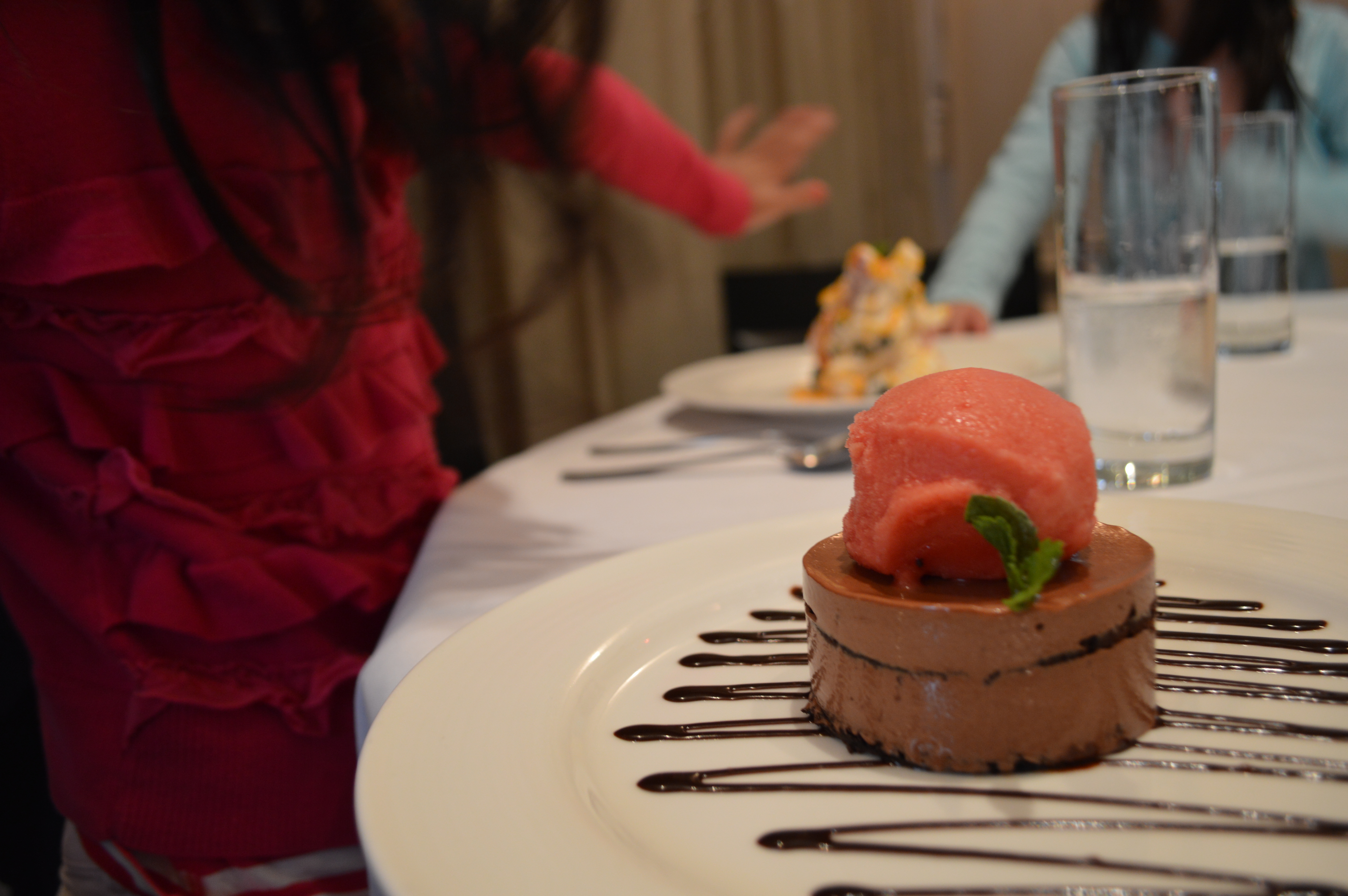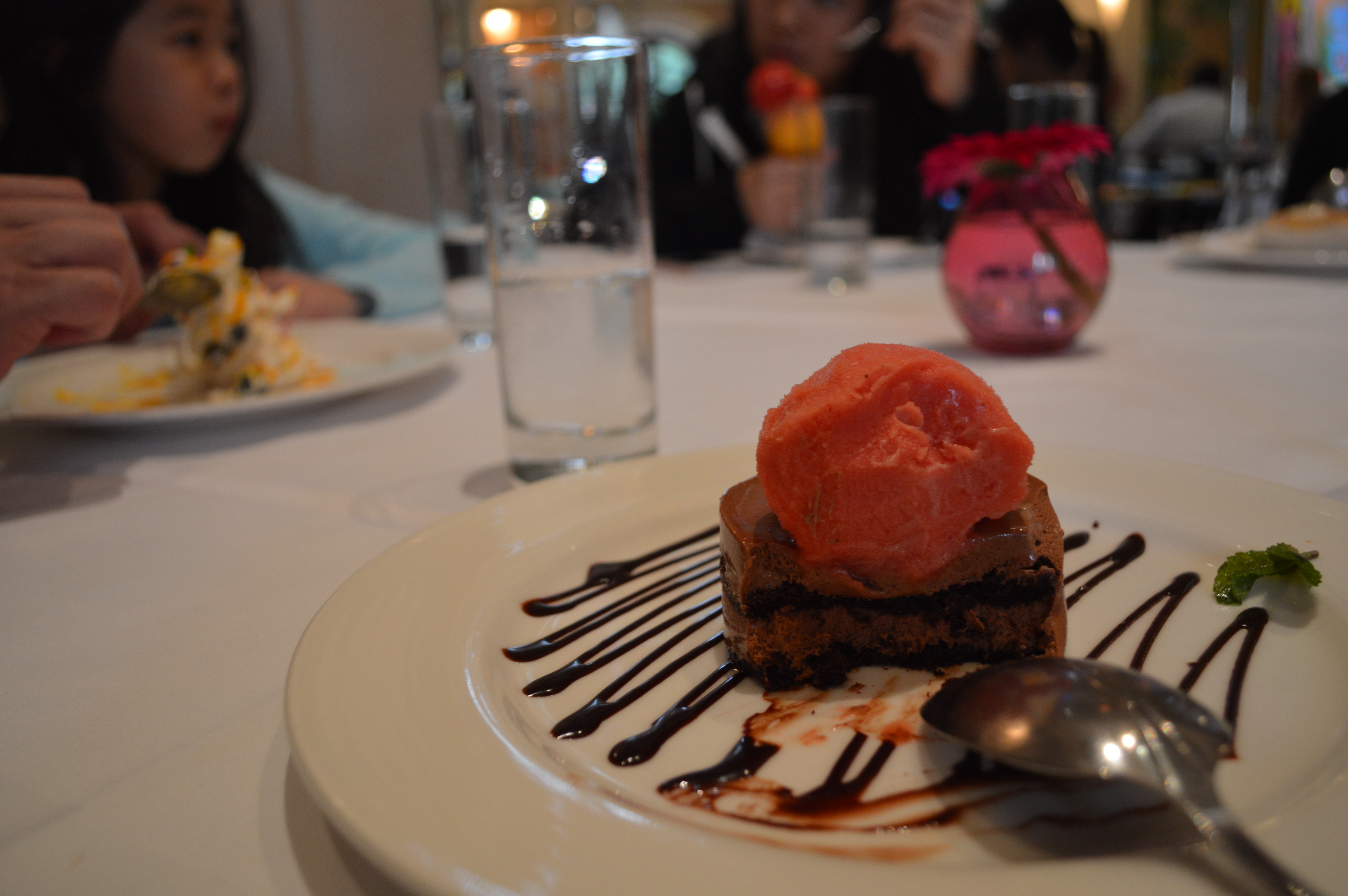 And finally, chocolate mousse topped with blood orange sorbet, and might I say it was bloody darn good. I mean, of course it couldn’t be stand-alone mousse, or the whole masterpiece would collapse on its knees. No, this was coupled with thin layers of dark chocolate brownie, giving it stability and textural edge. It was all set off by the burst of sweet tang contained within that perfect sphere of sorbet. Bloody good blood orange. It was even the perfect temperature to dig into!