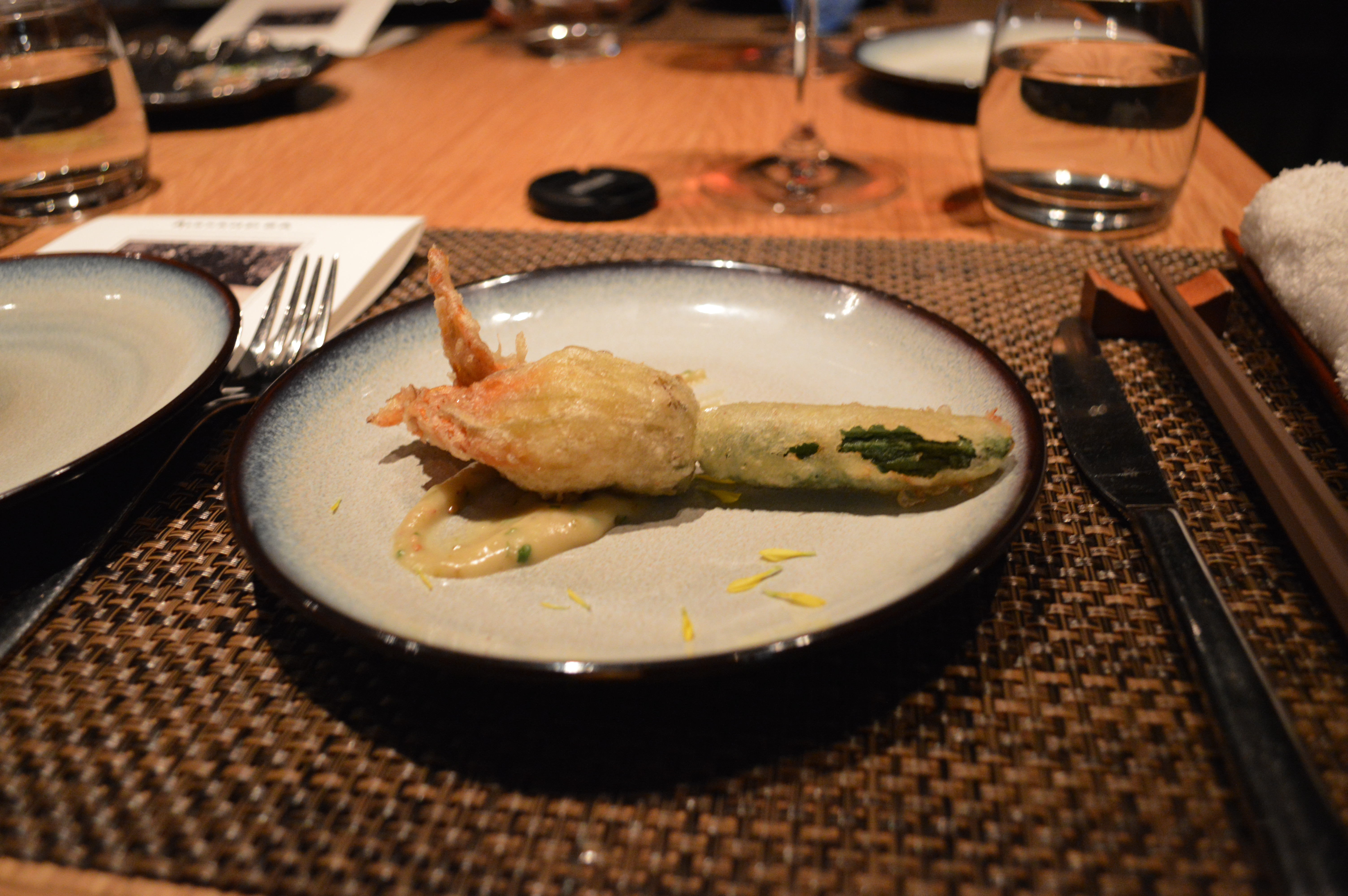 The fried zucchini flower was a light break during the rage of courses that night. The batter was airy but separated a little too easily from the flower, and its thickness merged with the flower made it seem almost incongruous. But a joy all the same.
