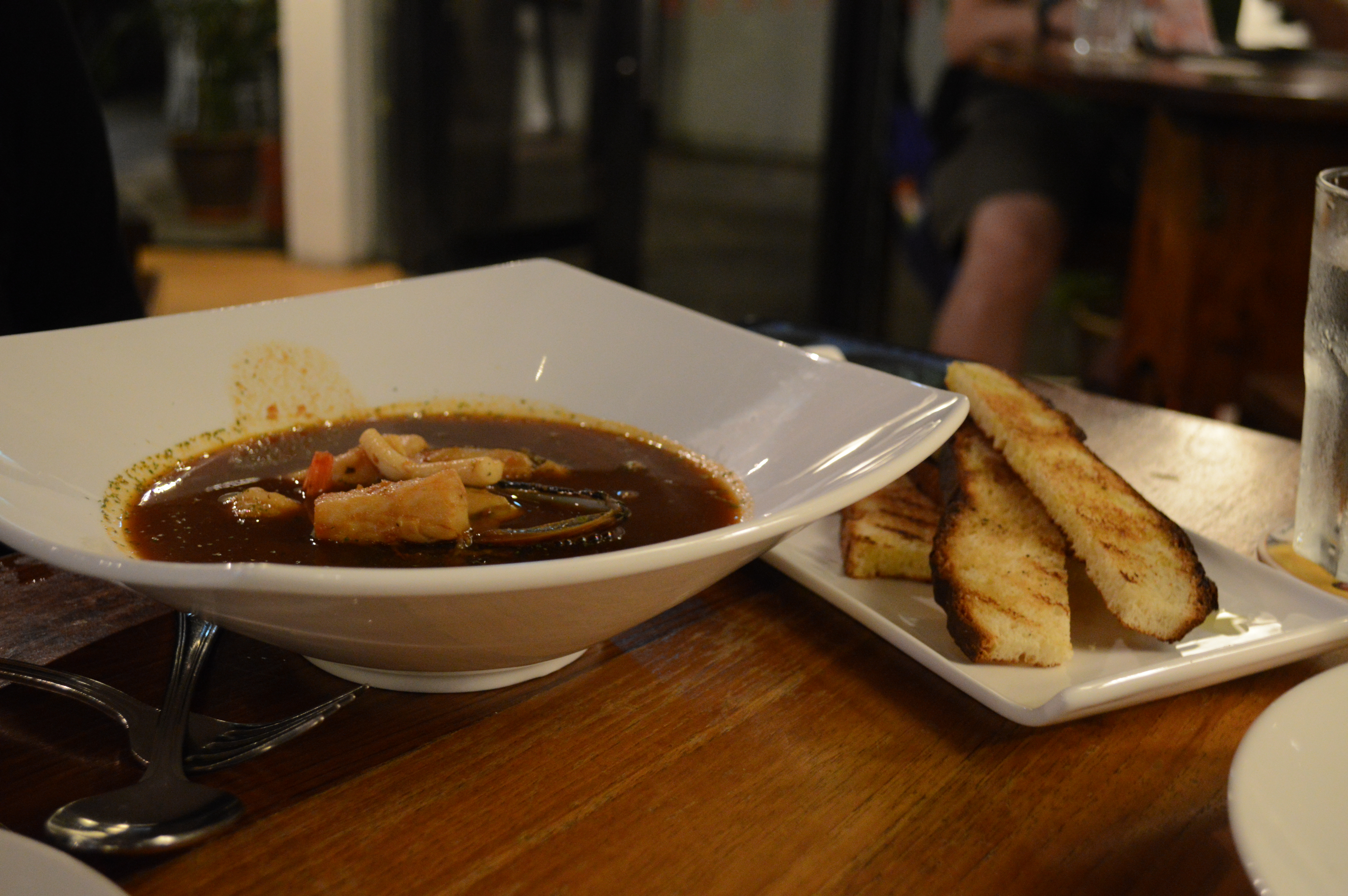 Seafood Bouillabaisse. Welcome to mussel, prawn, and fish fragments land. Coupled with a few bits of rather soggy buttered toast and a hollandaise-like dip which did little in complementing the toast. Appealing grilled marks though. These things make me jealous of the behind-the-scenes machinery. Grill marks are to me simply the epitome of grandiose home cooking. I think I need a grill pan soon. Just to be pretentious with my morning toast, you know. We dipped it in the surprisingly delicious bouillabaisse sauce instead. The dish was ho-hum, predictable, nothing flabbergasting.