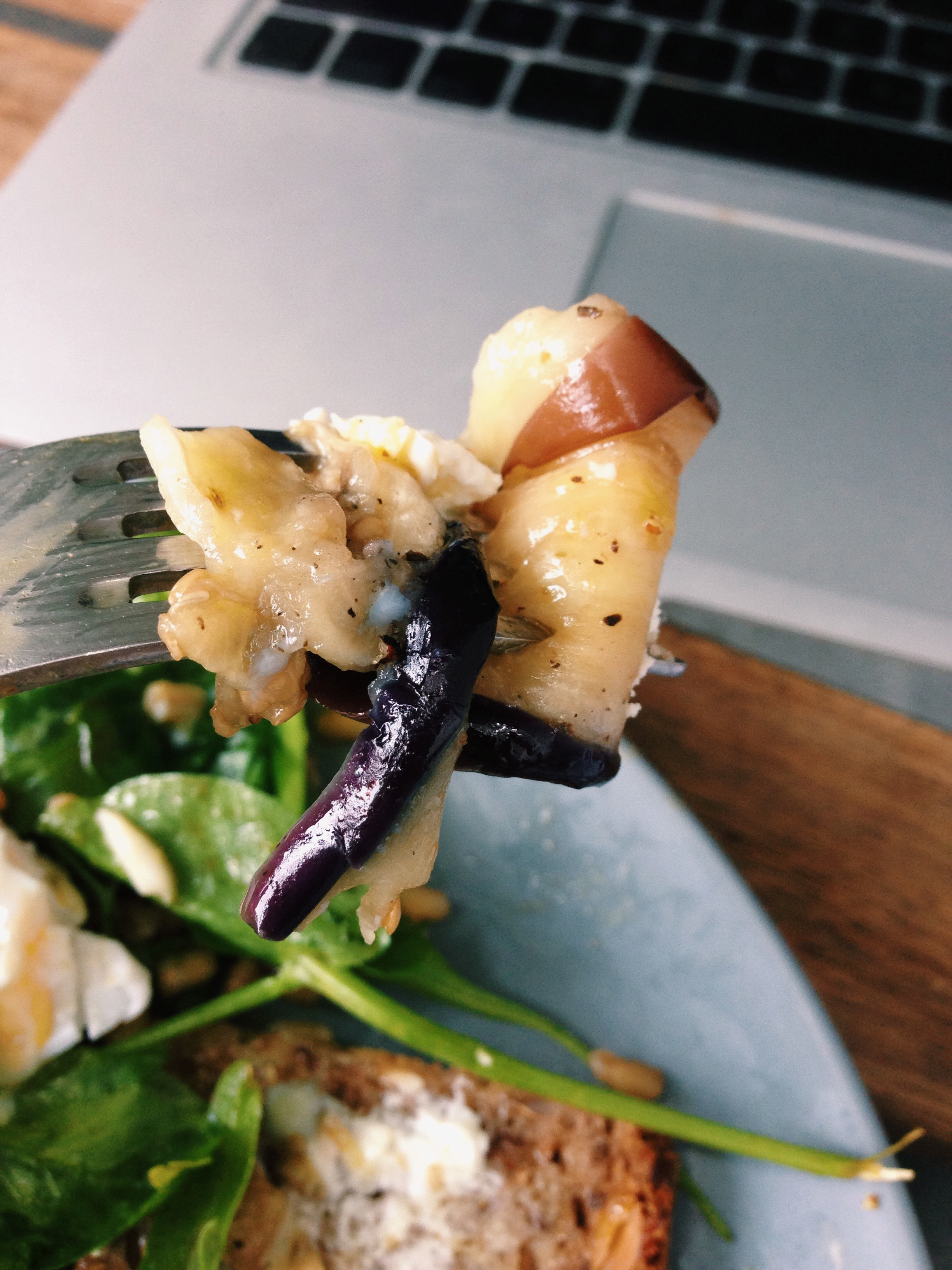 Let’s just say I wasn’t expecting it. I made my order, after a gruelling self-debate session. It’s the worst part every time I go on some solo adventure. Girl and Going Solo, with a large side of Indecision. I swear. But yes, my order: Iced cappuccino, and the poached eggs with goat’s cheese, eggplant, salad and their homemade rye bread. They had brunch specials, to my giddy surprise. And you heard that? Homemade. In house. Made from the heart. You can imagine how excited I was. Because you know bread and I go way back, and I adore the savoury twist of rye; its dense and wholesome flavour, packed with seeds, nuts and glory. I’ll try their sourdough another time, promise.