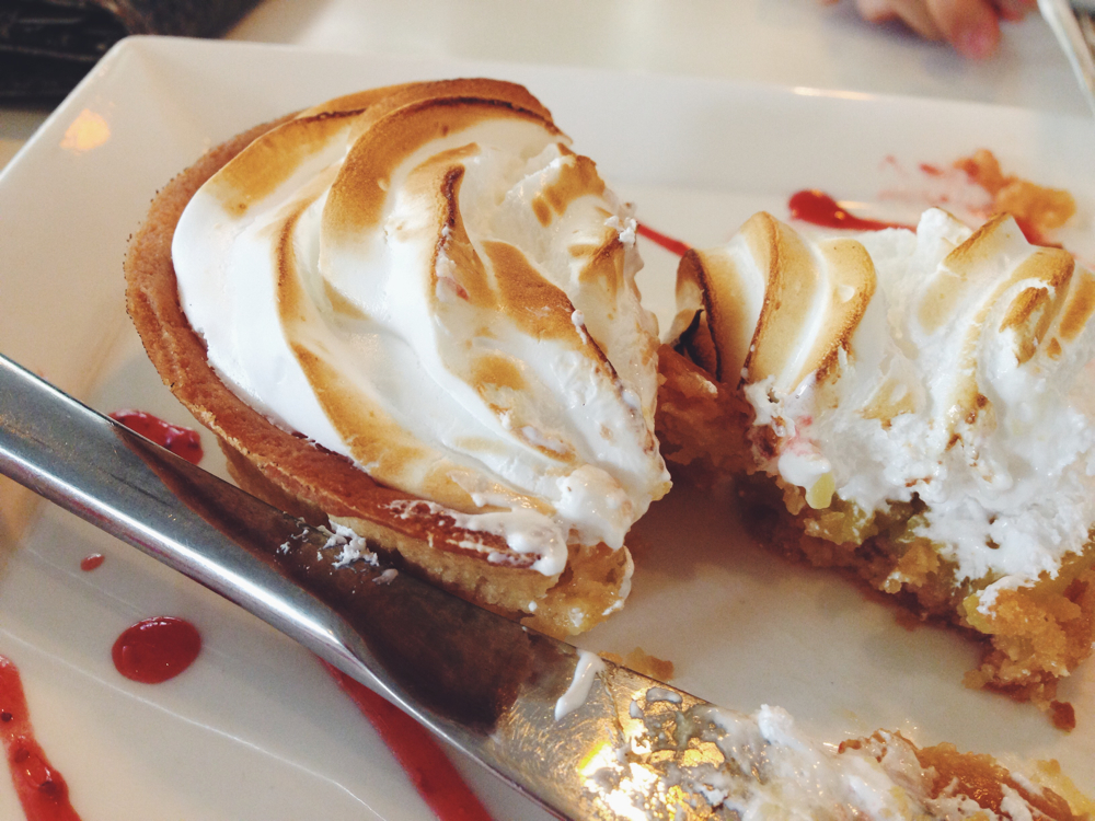 I’ve got a sweet tooth. So does she. What could we do? We had to order this lime basil meringue tart. We just had to. It looked like the rose among the thorns of sweet tarts, its meringue hat pulling it up a few rungs on the ladder of regality in the counter display. I’m actually not too sure about that pricing; I somehow remember it to be just that, though I could be wrong. I don’t even trust my own soggy memory. I was drawn in by those beautifully torched, thick swirls of meringue, some yellow or vermillion jewel of an interior lovingly encased by what looked to be a gloriously crusty, buttery pastry. Got it, sat down. Cut, pulled, mouth…
