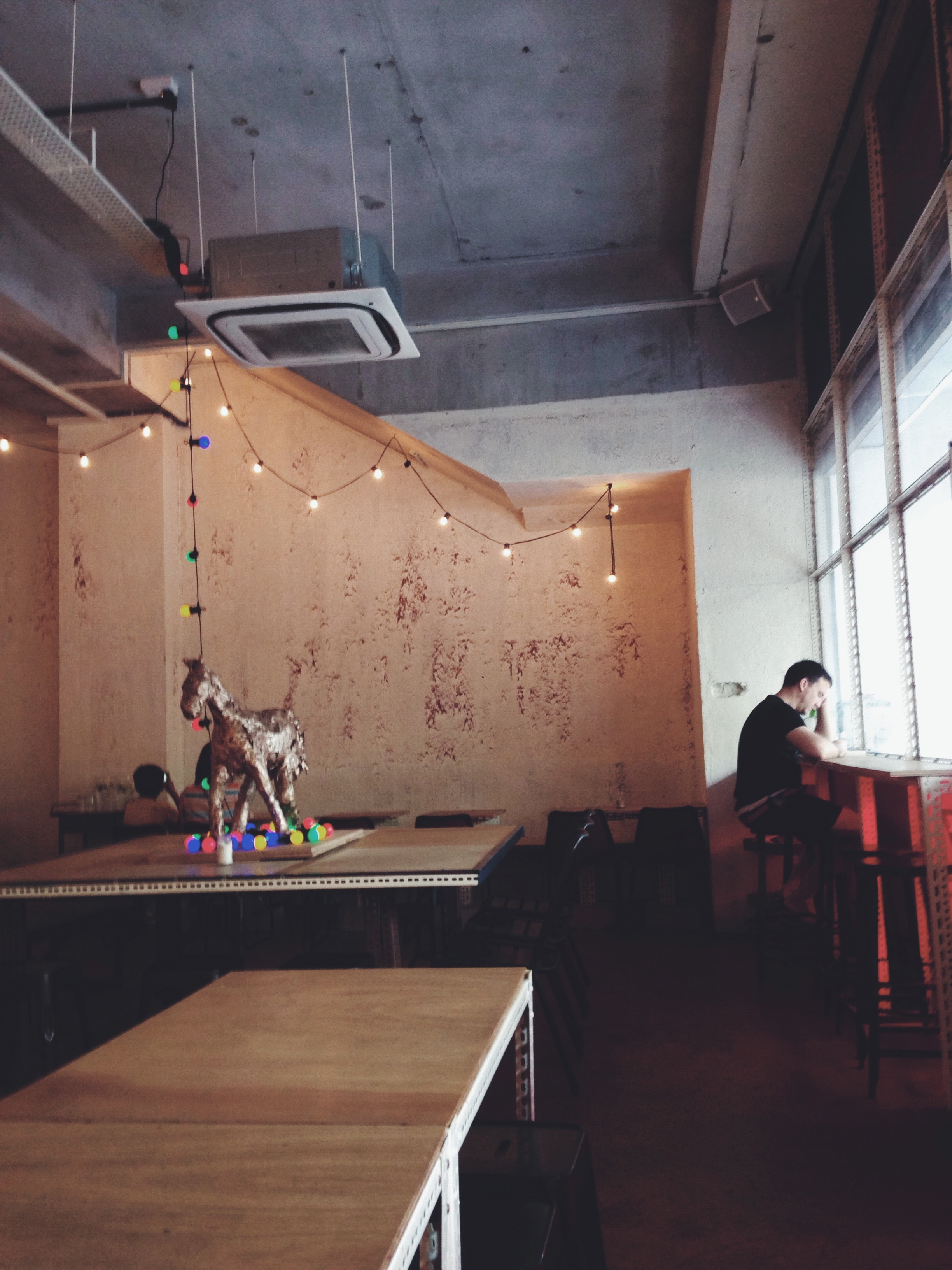 I don’t know about you, but I’m quite liking the old industrial theme of some places. Including this one. There was massive self-conflict this morning, when I was debating between hopping off to a more convenient spot, or deliberately trudging along unknown sidewalks in the heat to arrive at this signless, but rather enticing spot in the Lavender Street area. Neon red and black, almost translucent windows, stark, straightforward pale wooden furniture, the exclusive hidden feel. It felt as if there was a children’s party right before I walked in and they forgot to take home some decorations. Child VS sophisticate. I liked it.