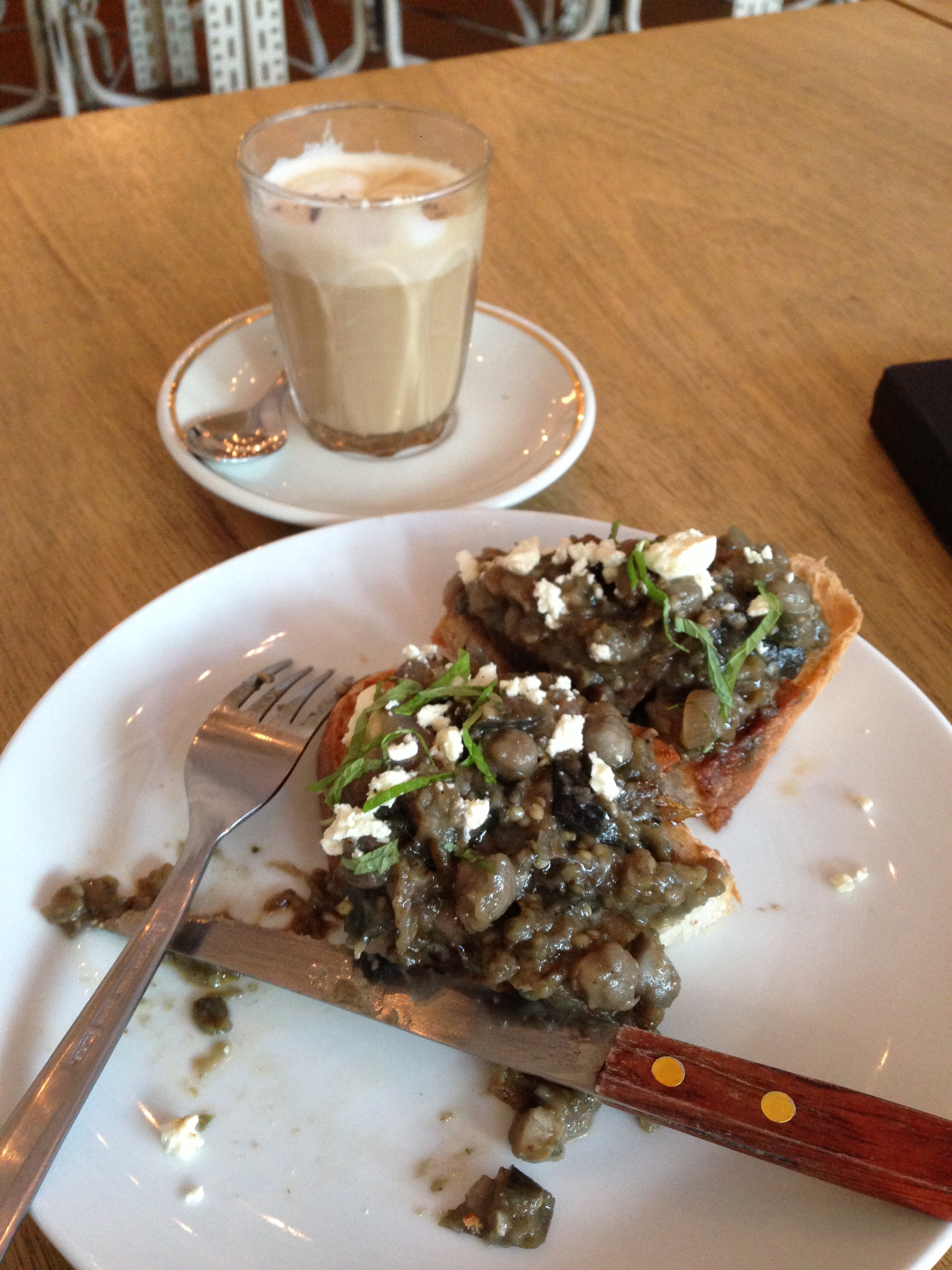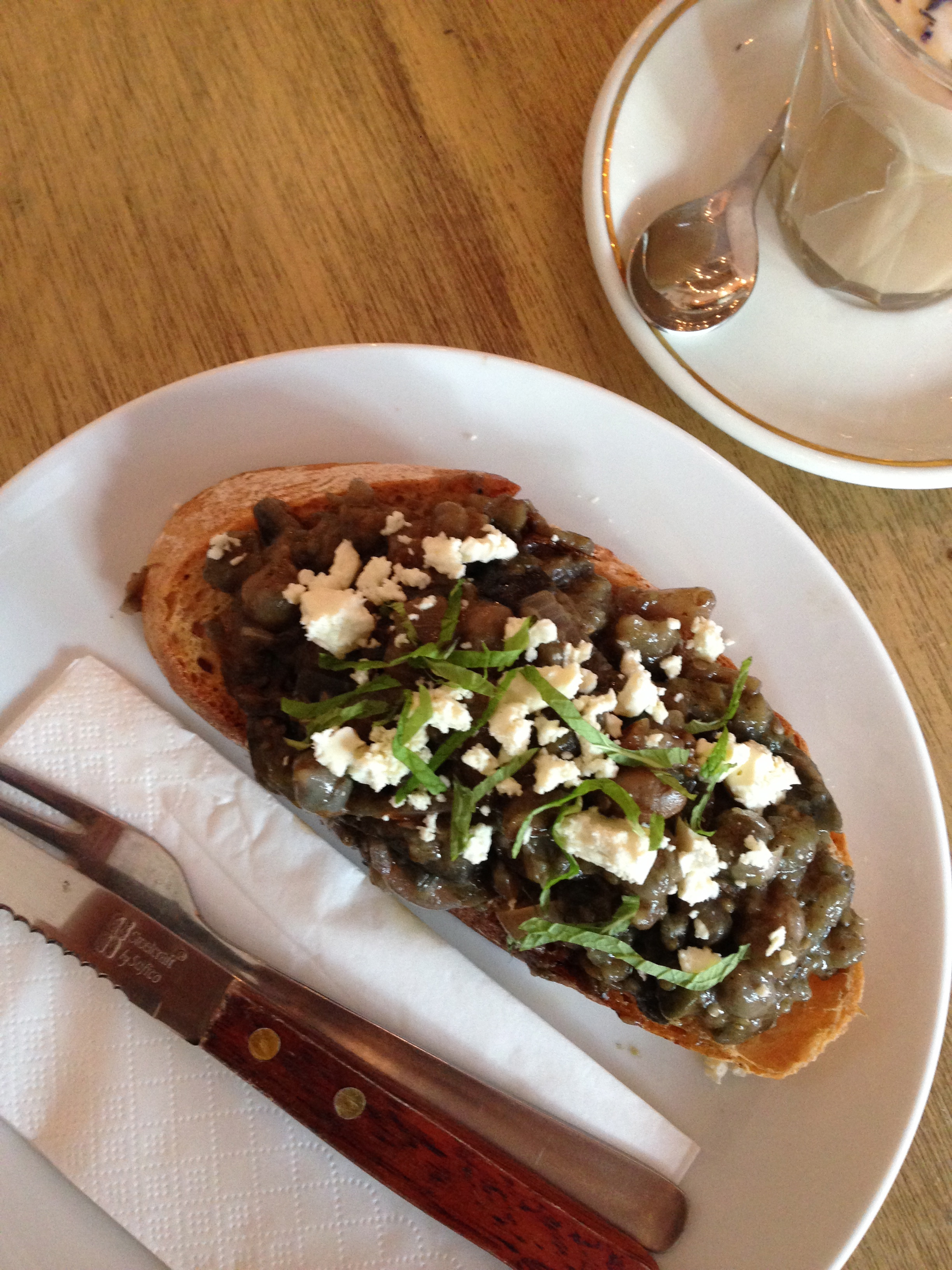 They are famous for their banana triple-stack pancakes, but for some ridiculous reason I was craving something a little more on the savoury side, and so I ordered this hulk of a brunch dish. Mushy, plump pieces of aubergine, translucent onions, fading mint. The chickpeas were tainted with the juices of the dark and stubborn vegetable they were cooked with. Looks quite a mess up there, but my fork told otherwise. There could have been more feta (sprinkles don’t cut it) to enliven the dish a little more, adding a better kick of flavour. Perhaps a bit more spice or pepper, but on the whole this was pretty darn delicious. I started to enjoy the dish even more as time went by, since the toppings melded so nicely with one another as they cooled down, allowing the flavours to emerge properly on my palate. The sourdough yielded a wonderful flavour and was properly oiled and toasted.