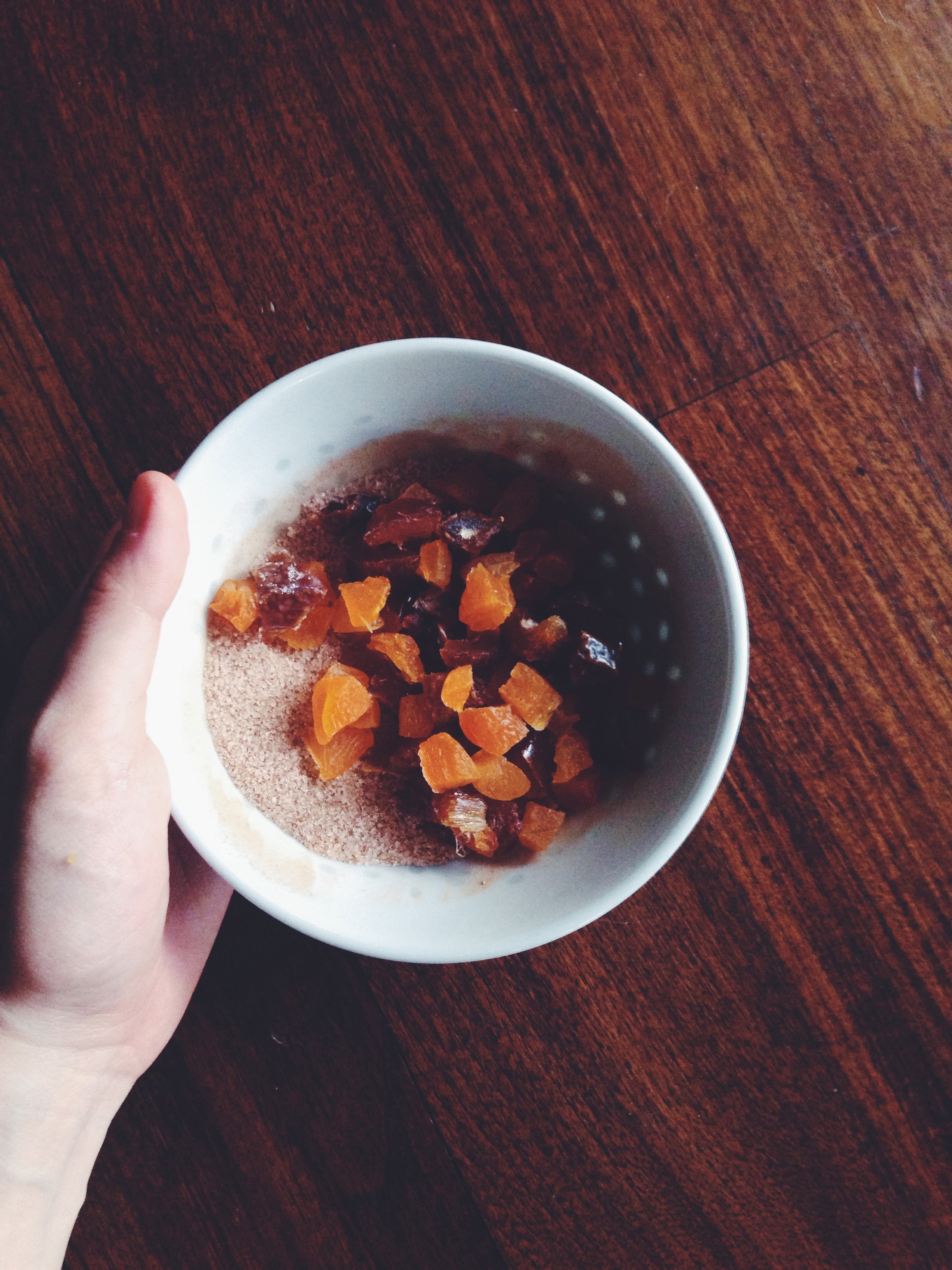 half a cup of chopped figs and dried apricots (you can use anything really. If you have nuts/ dried cranberries/ raisins/ currants, then go for it). It should all amount to around 65g.