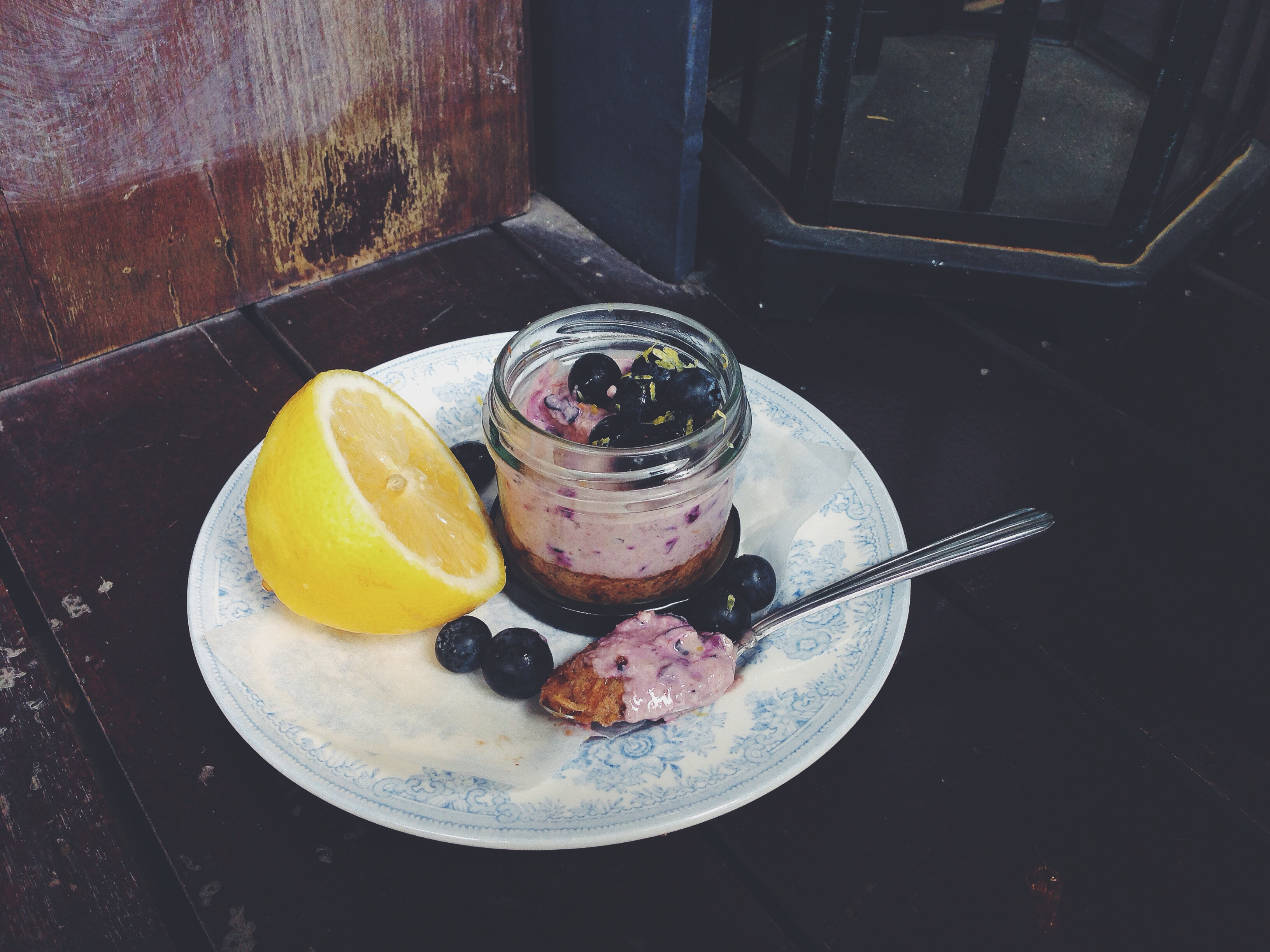 Throw in the ingredients for the cheesecake mousse and blend everything together well. I liked the addition of raw almonds for a bit of crunch, but you can leave those guys out. Once everything is well blended, pour the mix, which should be thick but slightly wet, into the mini jar. Let this set in the fridge for at least a couple of hours. This actually makes a rather good breakfast treat so make this the night before, and the rest is blissful history! Before eating, top with fresh blueberries and more lemon zest. I imagine some yoghurt and a bit of honey would be lovely too.
