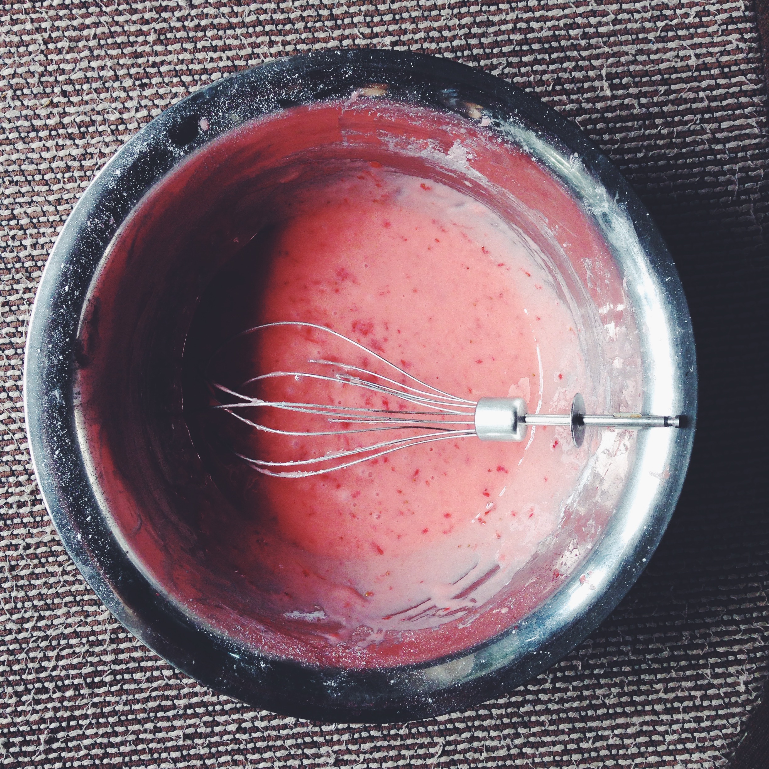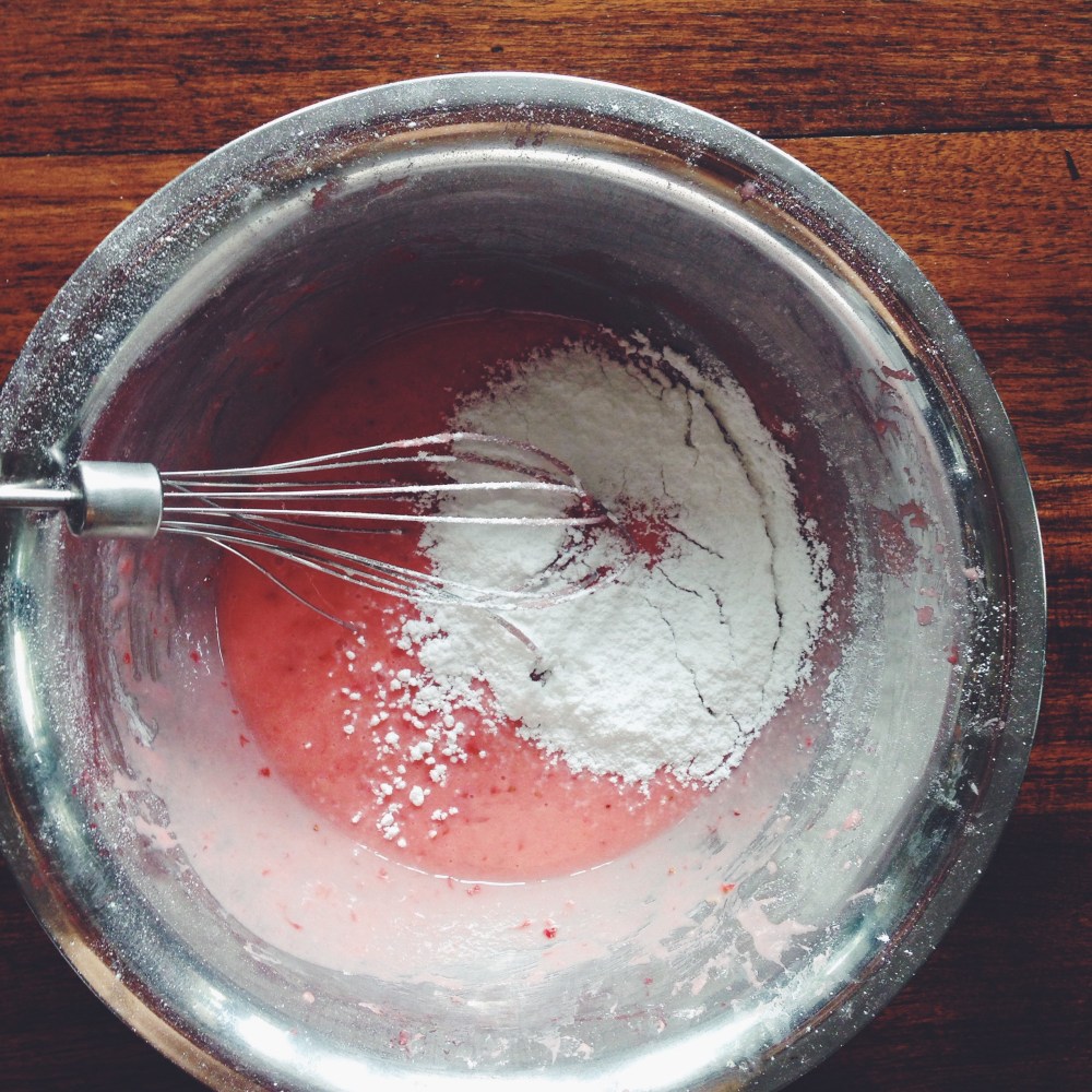 Purée the chopped strawberries in a blender, or you could microwave them and then mash with a fork. Put the strawberries into a large bowl, then using a tablespoon, remove any extra liquid that seeped out. It won’t be much, and you need not remove all of the extra juice. Add half of the icing sugar first and the salt, and mix together with the same tablespoon until you get a wet, dark pink mixture. Add the rest of the icing sugar and continue to mix until you achieve a thick, spreadable consistency.