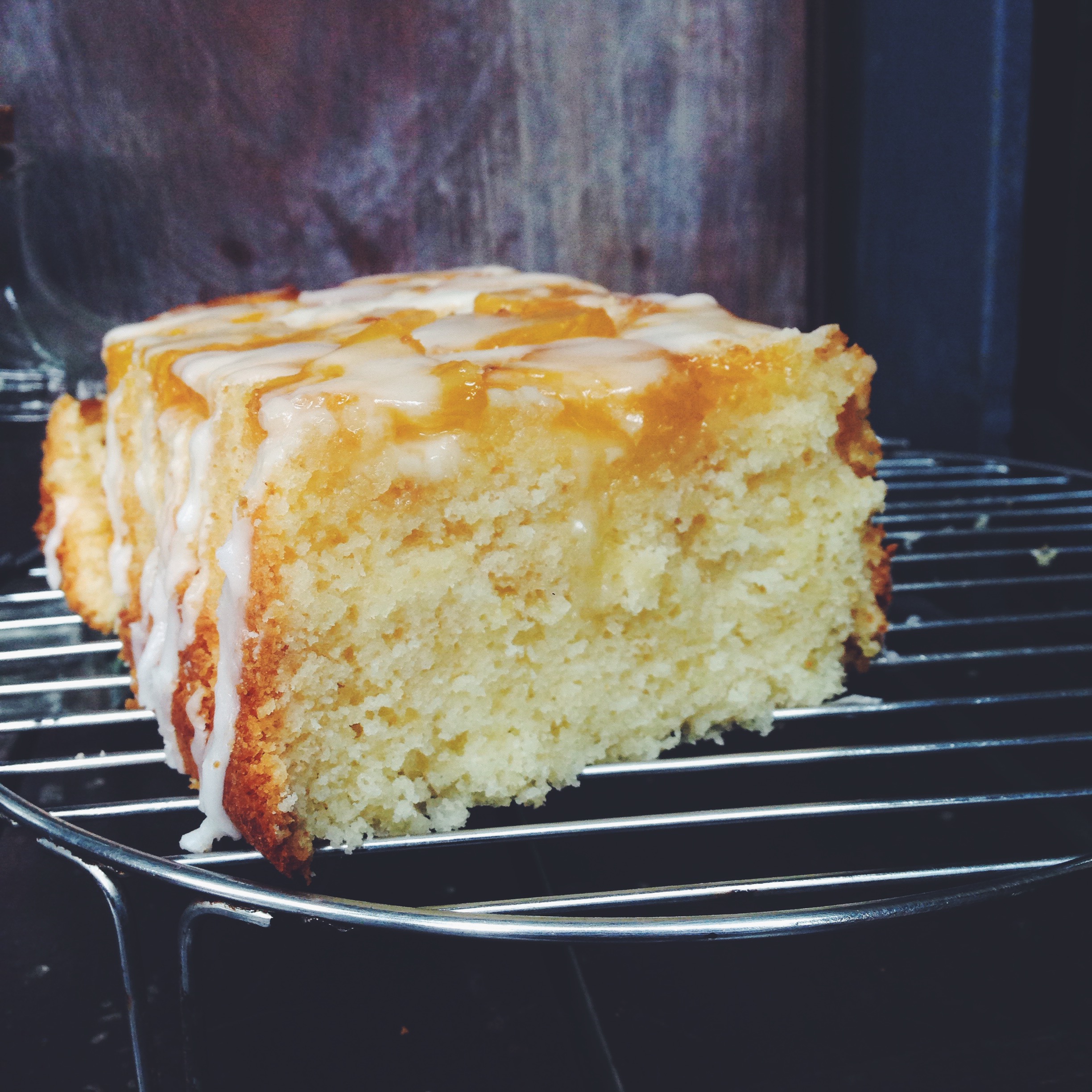 Tip batter into the loaf tin and bake for 40-45 minutes; mine took 42. Insert a wooden skewer into the middle of your loaf at the 40-minute mark– leave it for another couple of minutes if the skewer emerges wet and sticky, but take it out if it comes out dry. A few moist crumbs at the tip are fine, for the pineapple chunks at the bottom make it stickier and wetter than the other parts of the cake. While the cake bakes, make the glaze. In a bowl and with a fork or spoon, mix together the lemon juice, pineapple juice (or more lemon juice) and icing sugar. Play around here; you should have an opaque, white glaze. It should easily run when you hold the spoon at a height, but the stream would become reluctant once it starts thinning.