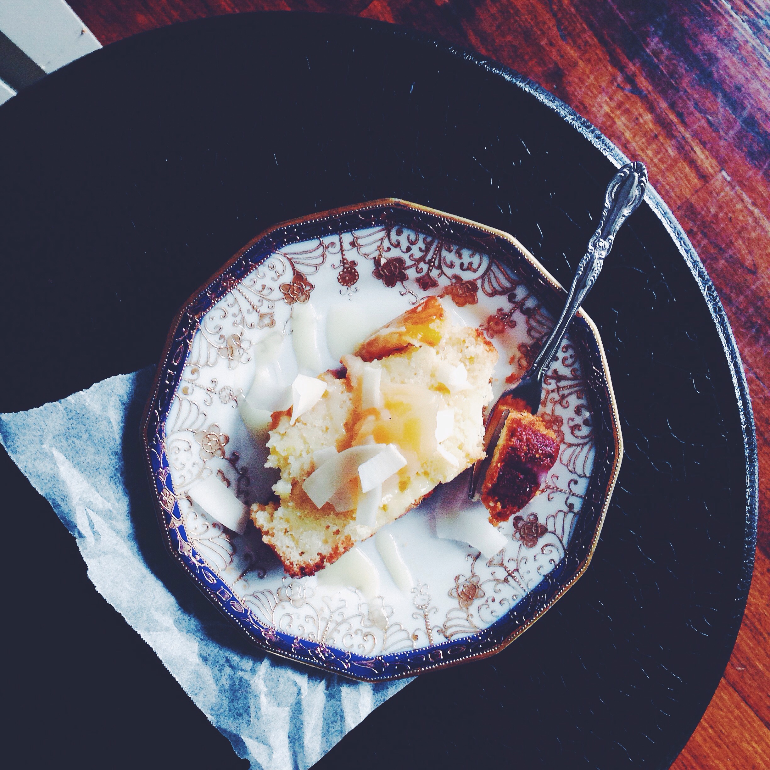 {Above: served warm with lemon curd, a drizzle of condensed milk, and coconut chips}