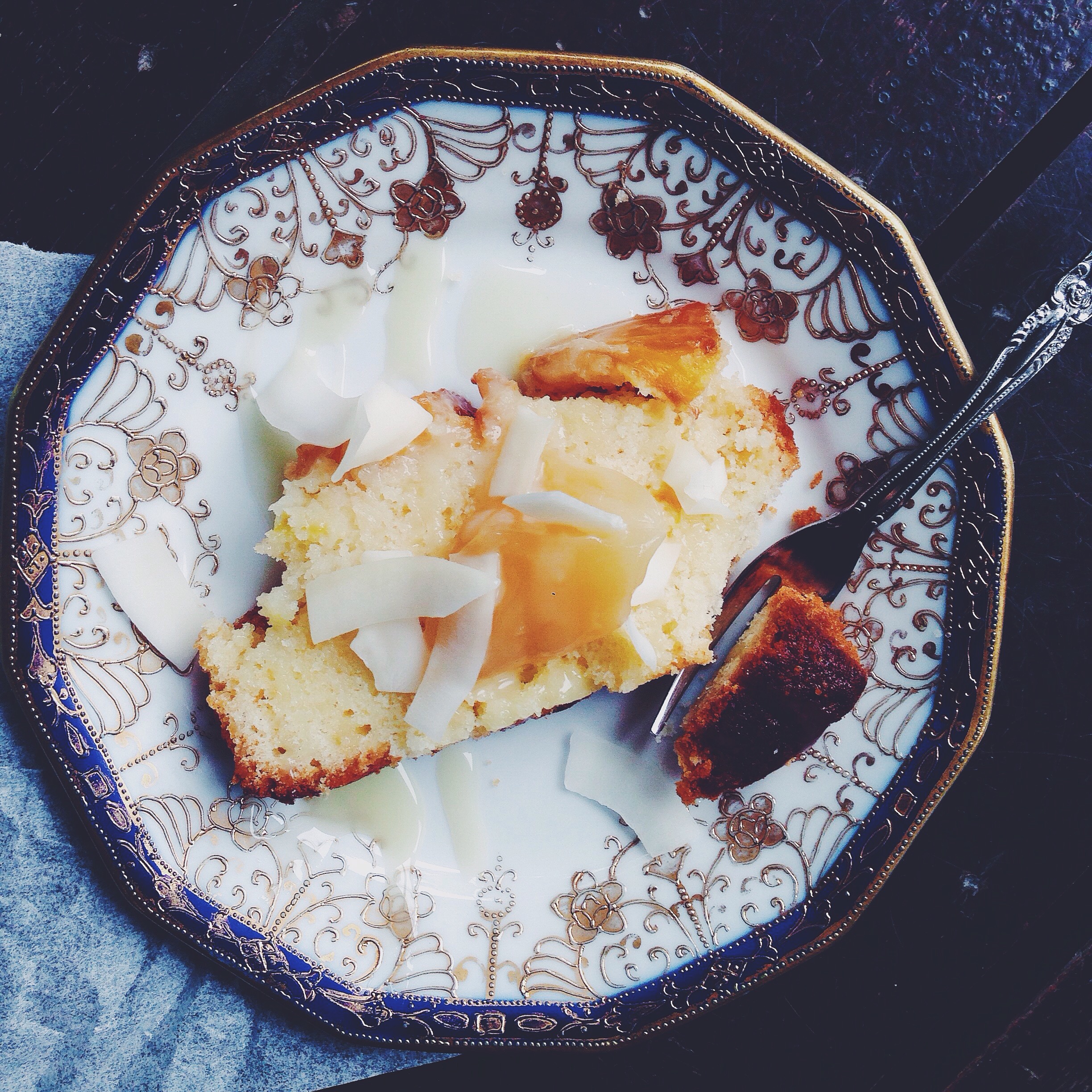 Scavenging the kitchen left me with some leftover pineapple from last night’s dessert and, well, not much else. Pineapple loaf cake has been done before, upside-down variations galore, and my finding of condensed milk in the fridge led to this mild twist. I must say it was fun to play around with the ratios; it turned out to be the perfect balance of sweet from the condensed milk and tangy from the use of both fresh pineapple and pineapple juice. Here, there’s not much flamboyance, and hardly any finesse. Funnily enough, it’s exactly this lack of properness that provides the right amount of charm.