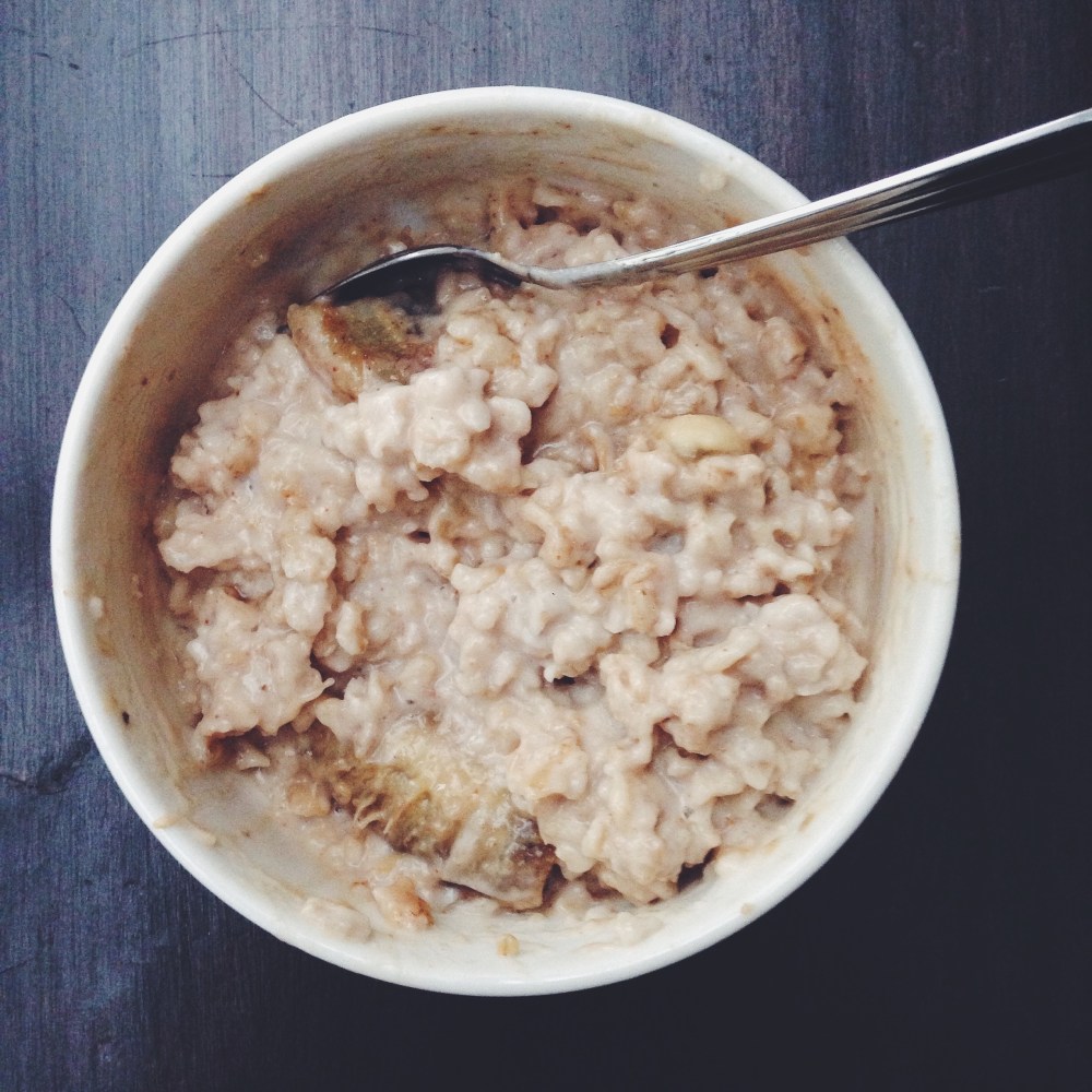 And you’re done! At this point, you can add whatever you want. My standard toppings are more banana, a heaping tablespoon of almond butter (cashew/peanut/almond), blueberries for a nice tang to cut through the sweet goop, and plenty of honey or maple syrup. Once the oatmeal is a little cooler, I also add a dash of cold, whole milk.