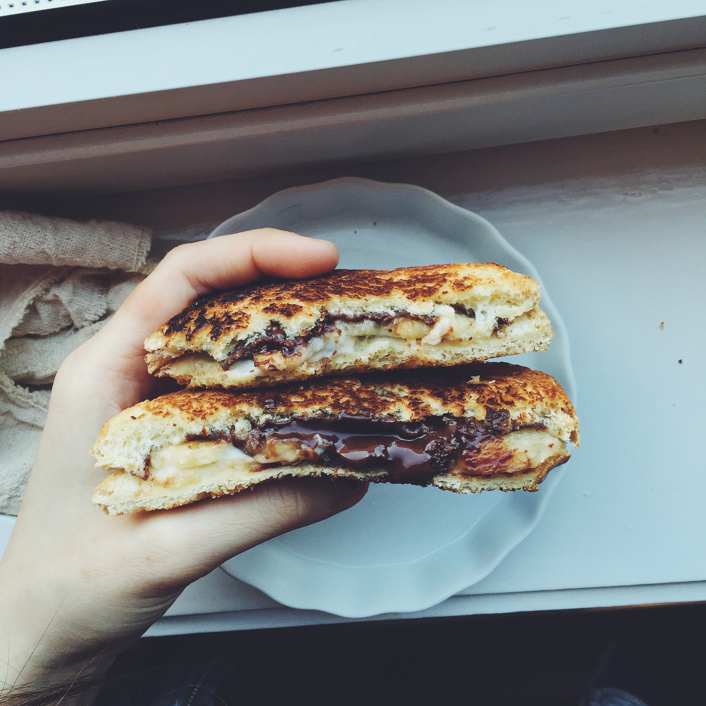 A quickie, because I want you to make it now, or at least soon, before the magic of what you see above dissipates. Chocolate and banana is a sworn classic, at least to me anyways, and this sandwich has all the goods and more. I wouldn’t call it ‘chocolate and cheese’, because that juxtaposition looks and sounds sacrilegious, because I might as well say ‘chocolate and cheddar’ and make you all gag.