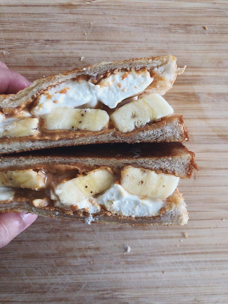 Heat your pan on medium heat and press the sandwich down. Use a spatula to press it. After around 4 minutes check the underside of the sandwich with your spatula- it should be golden-brown and the marshmallows should look melty. Flip the sandwich over and press down again. Cook for another two minutes. The banana should be soft and the peanut butter and marshmallows should be soft and melty. Cut whichever way you want and enjoy alone or with a strong coffee.