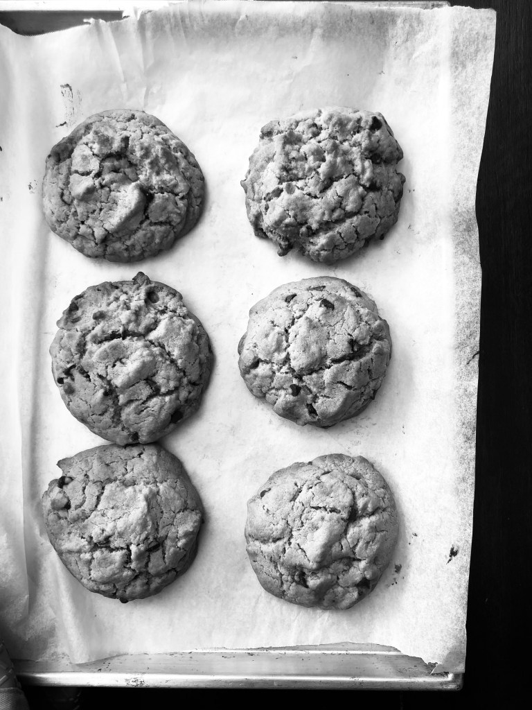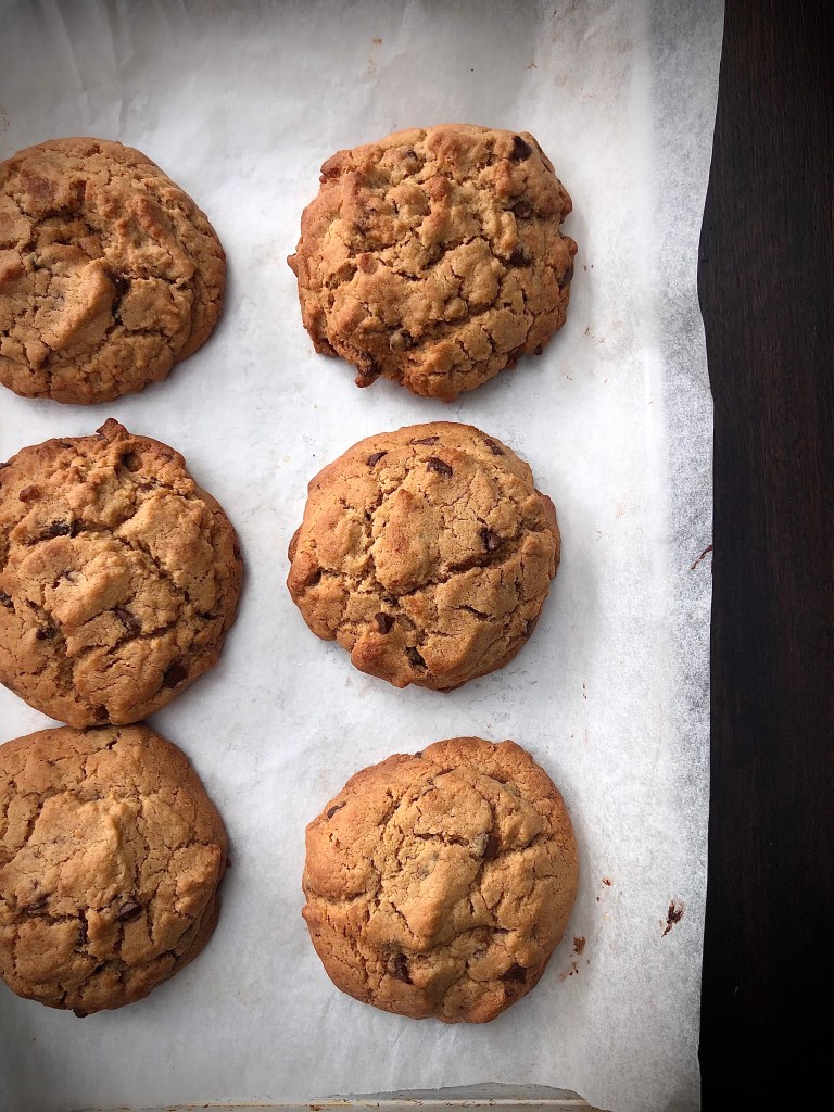 Add the flour, baking soda and optional chocolate chips. Use a spatula to fold the dry ingredients into the wet, bringing everything together until you get a sticky, thick batter. Use an ice cream scoop or your hands to scoop large golfball-sized clumps of batter onto your prepared pan. Sprinkle on the optional coarse salt on top. Bake for 10 minutes, then take them out and let cool and set for another 10 before eating. These cookies keep well for up to 3 days in an airtight container at room temperature, but you can also freeze them. Take out and microwave one for up to 2 minutes with a break after a minute, for a warm cookie. Best eaten with vanilla ice cream, or with a steaming cup of milky coffee!