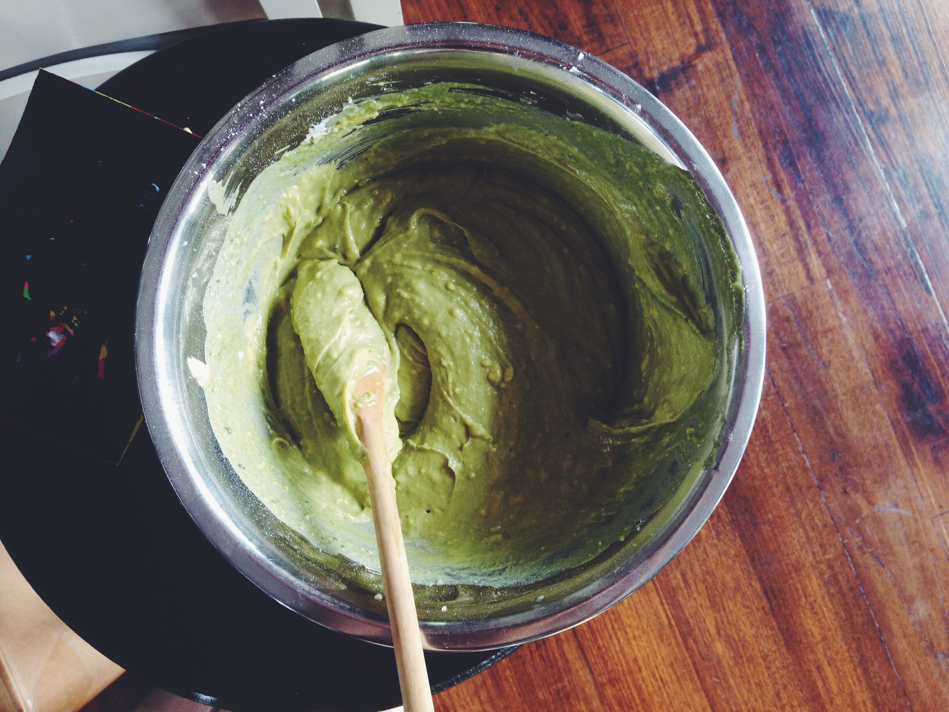 Preheat your oven to 170C (350F) and spray a muffin tin. In a large bowl and with a normal or electrical whisk, beat the butter and sugar together on high until pale and fluffy. Beat in the eggs and vanilla. In another smaller bowl, whisk together the dry ingredients- flour, bicarb, matcha powder and salt. Using a spatula, fold the flour and matcha mixture into the wet mixture.