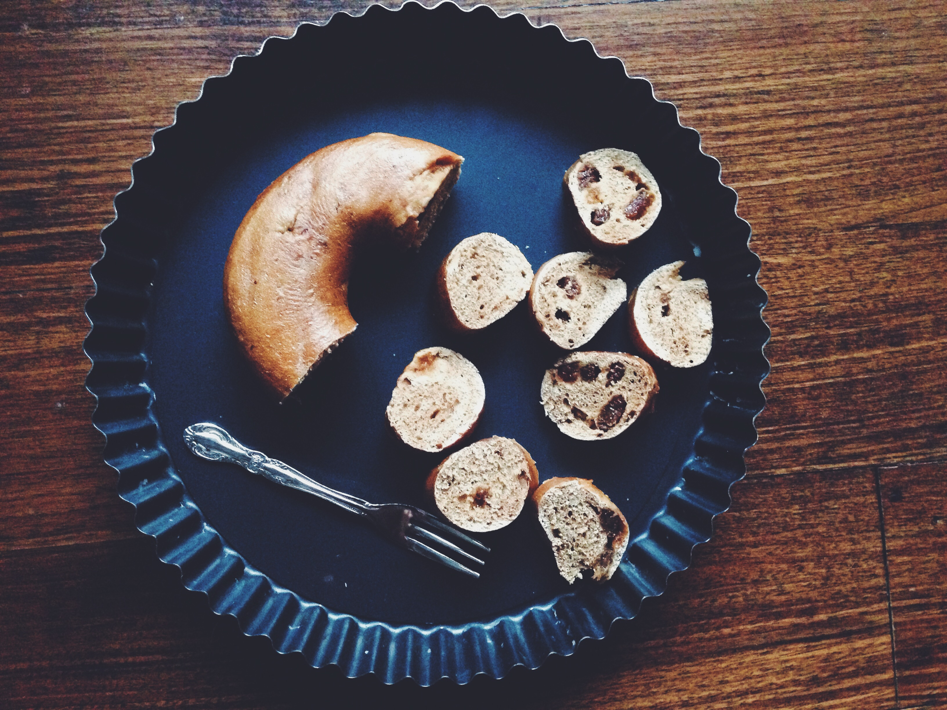 For one person, take one bagel (I used cinnamon raisin here) and slice into discs around 3/4-inch thick using a serrated knife. Preheat a pan on the stove to medium heat. In a shallow dish and with a fork, whisk together one egg, one tablespoon of softened cream cheese, a squeeze of honey and a splash of whatever milk you have on hand. I didn’t use cinnamon because I used a cinnamon raisin bagel, but add a dash of that if you would like. Soak each bagel disc in the egg batter for at least 10-15 seconds on each side, and then flip to do the same on the other sides. To your preheated pan, add a generous pat of unsalted butter, then lay all the discs on the pan. Wait around 30 seconds to cook on the first side, then flip, starting with the disc you first laid down.