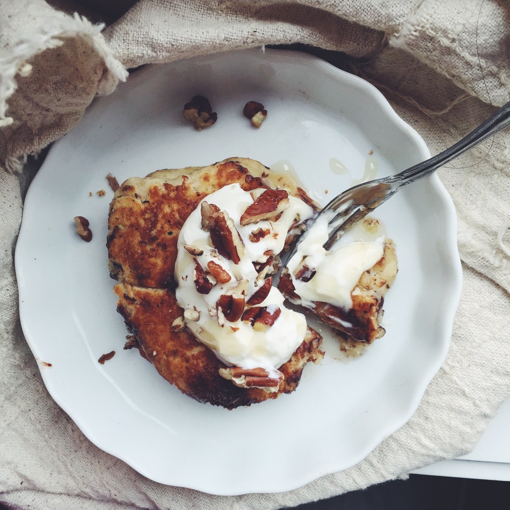 Butter your pan. Using the same spoon, dollop clumps of batter onto the pan. Make mini coins or large round ones. Whatever you fancy. Wait for bubbles to appear around the sides and in the middle. Once bubbles are visible in the middle, wait a little while longer, for at this point they are still pretty fragile. After around 4-5 minutes, check the underside. Yours might take a little shorter, so just check and see. Once you are able to slide your spatula under the whole underside of a pancake, do a quick flip and cook the other side. The other side takes much shorter to cook, around 1-2 minutes. Layer the pancakes on a kitchen towel to absorb excess grease or moisture, or just serve immediately on plates.